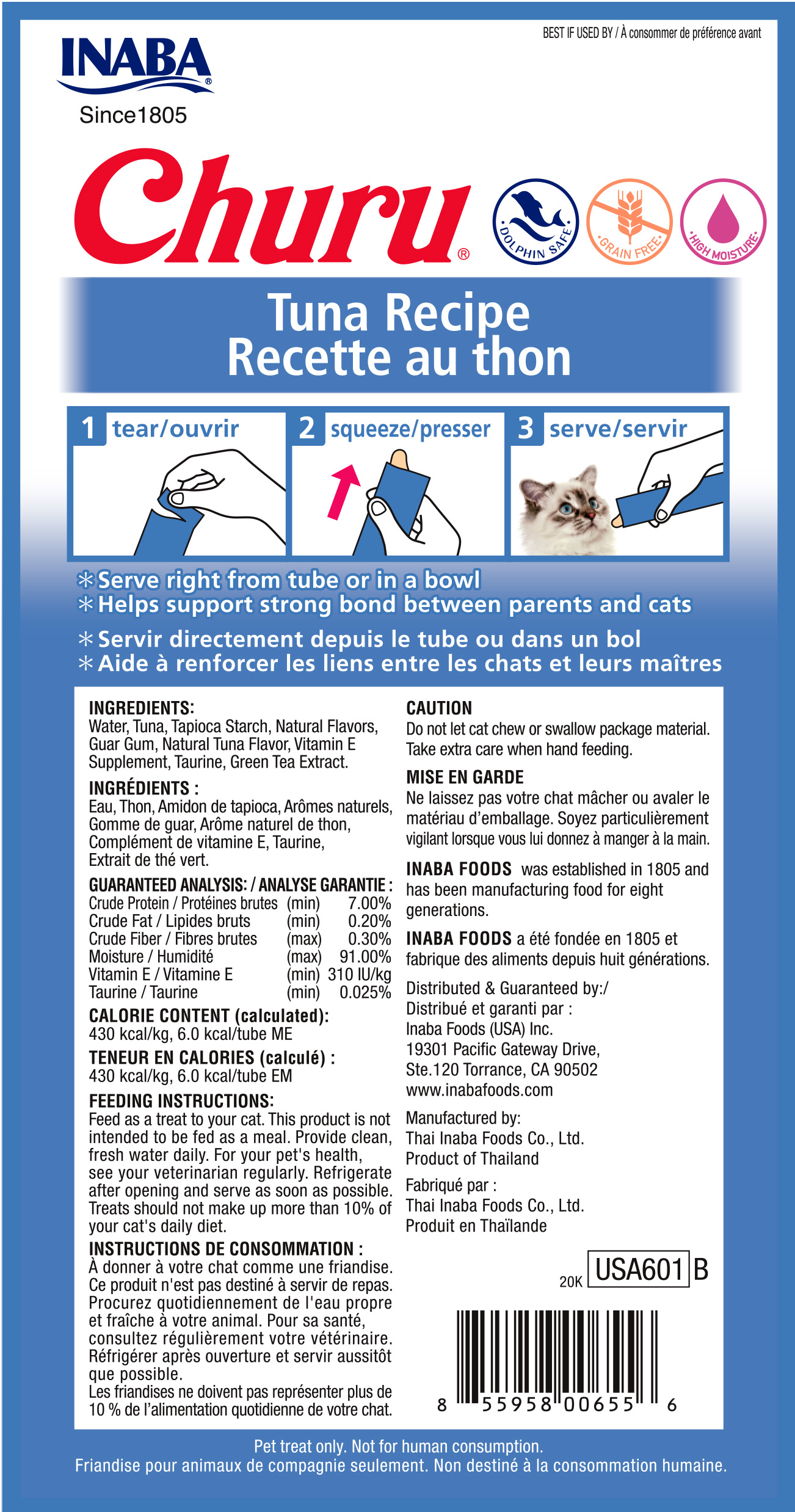 Inaba churu cremoso elaborado con ingredientes de grado humano. Libre de granos, colorantes y preservantes artificiales. Fortalecido con Vitamina E y té verde.