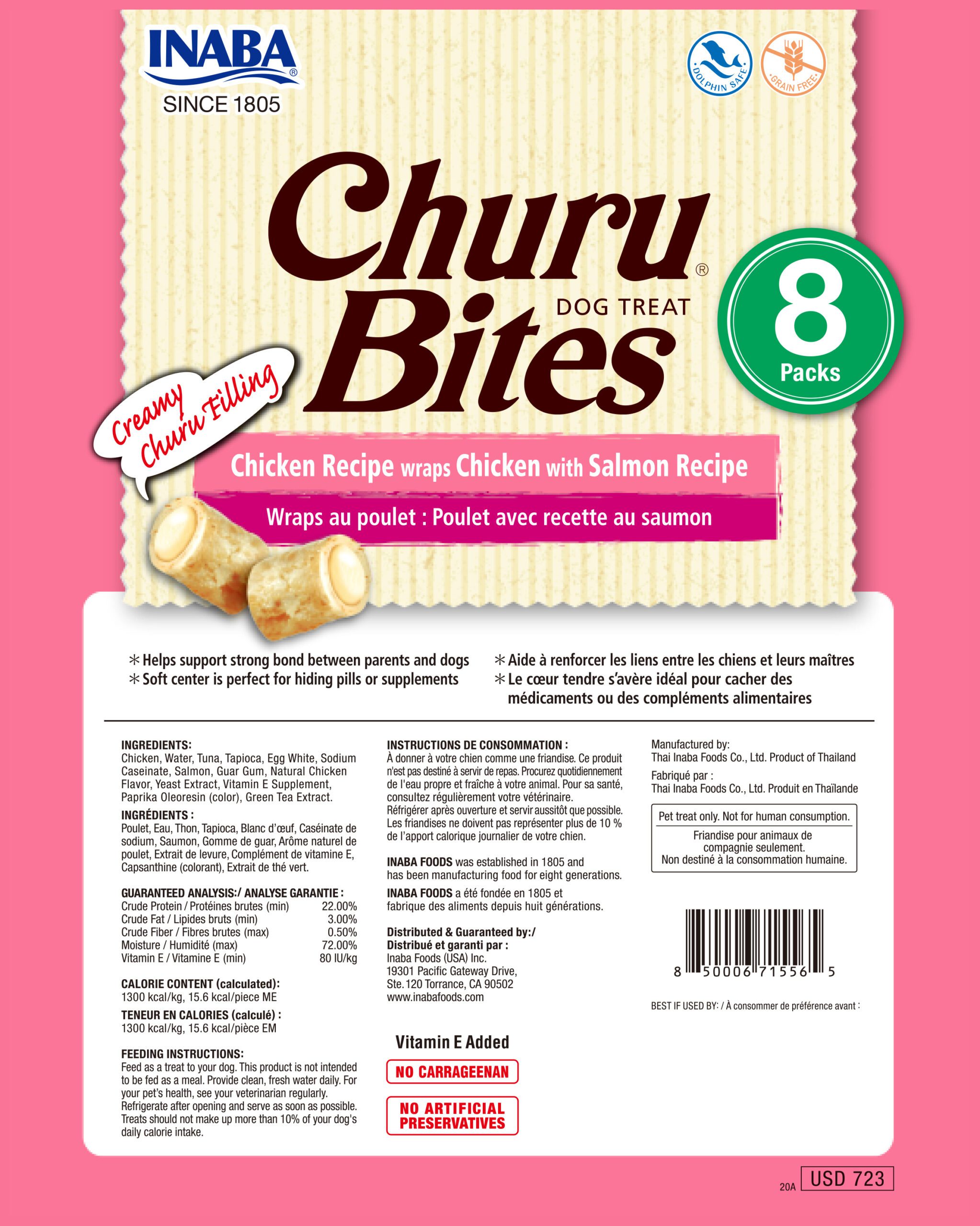 Inaba Churu Bites Wraps de Atún (sobre con 3 paquetes) ofrecen una combinación única de texturas: un relleno cremoso de Churu® en el interior y una pasta de pollo horneada suave en el exterior. Elaborados con pollo y atún salvaje 100% natural, son libres de granos, conservantes y colorantes artificiales. Enriquecidos con vitamina E y extracto de té verde, son snacks saludables diseñados para mantener a tu mascota feliz y satisfecha.