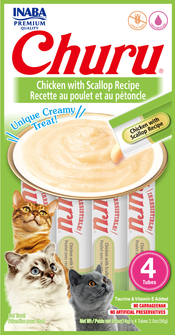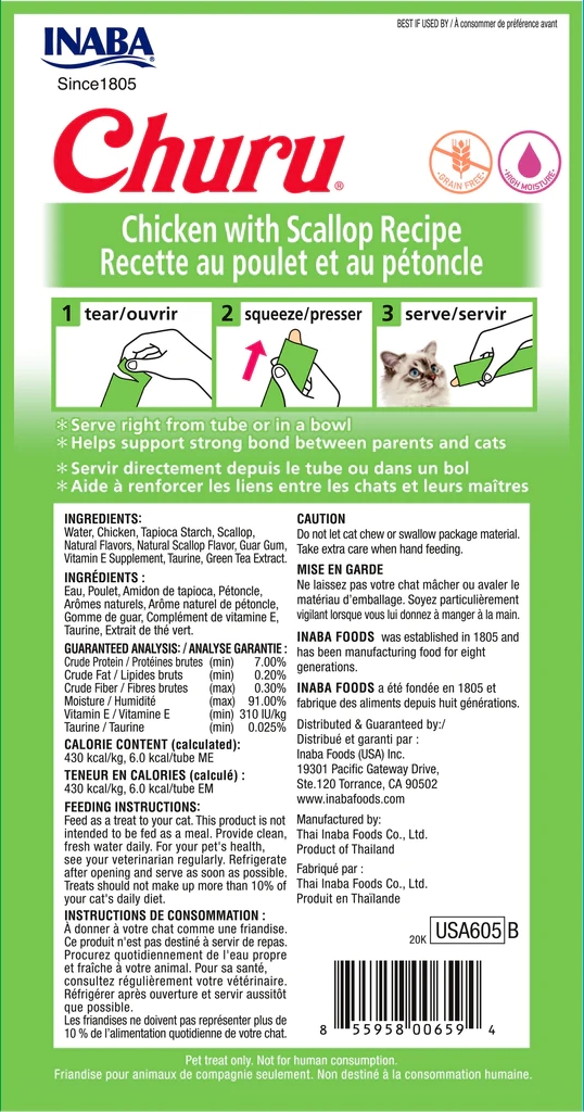 Inaba churu cremoso elaborado con ingredientes de grado humano. Libre de granos, colorantes y preservantes artificiales. Fortalecido con Vitamina E y té verde.