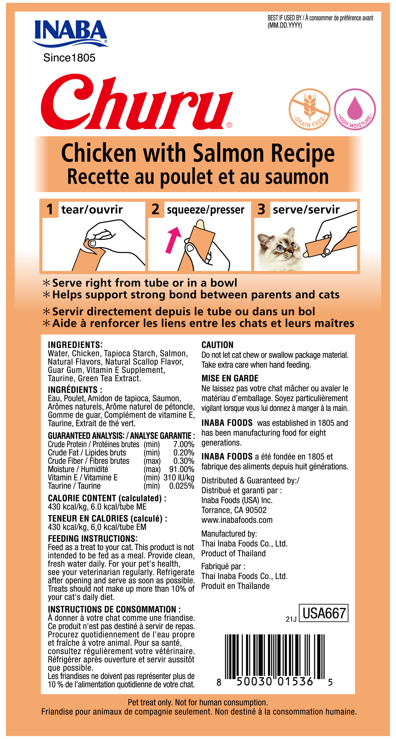 Ciao Churu™ Pollo con Salmón es un novedoso y delicioso snack* para gatos de textura cremosa (puré) y alta palatabilidad. Tiene un alto contenido de humedad lo que encanta a los gatos y además contribuye a su hidratación. Con delicioso sabor de atún y camarones. Cada paquete contiene 4 tubitos de 14 gr c/u (Total 56 gr). Libre de granos, sin conservantes ni colorantes artificiales.