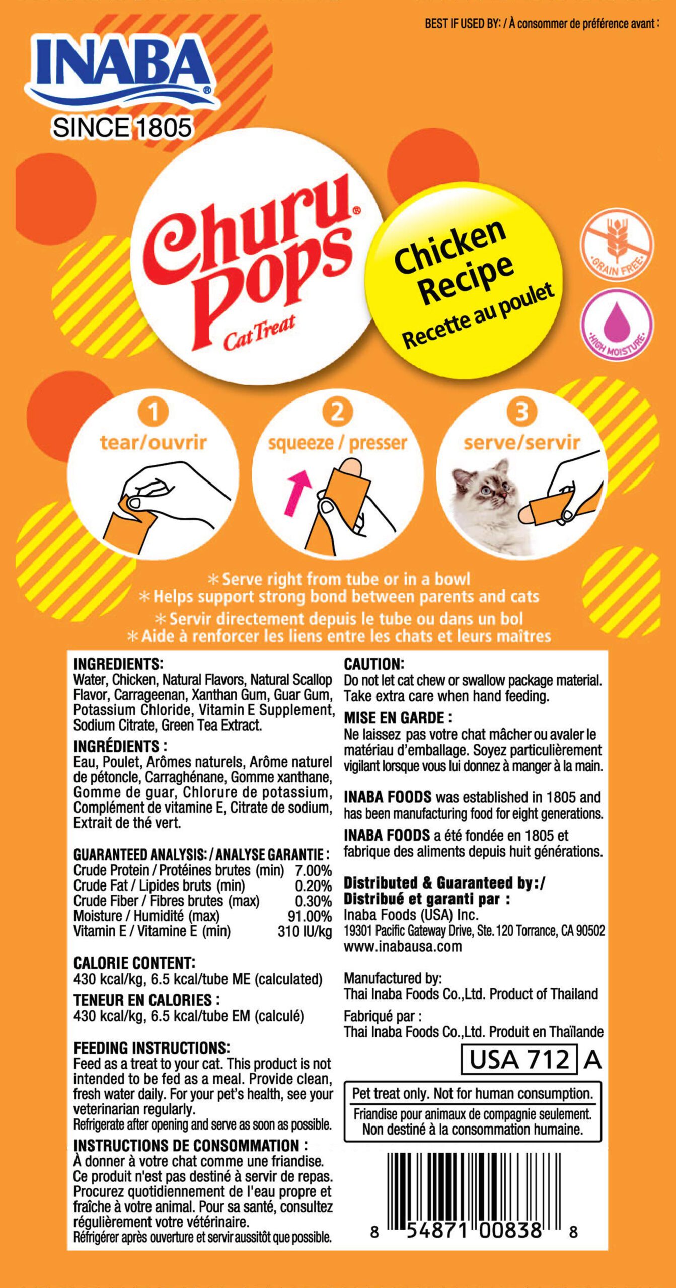 Inaba Churu Pops Sabor Pollo (sobre con 4 tubos) son snacks nutritivos y deliciosos hechos con pollo de granja. Con una textura jugosa y alto contenido de humedad, contribuyen al bienestar general de los gatos. Su formato permite alimentarlos a mano, en un tazón o como aderezo para sus alimentos. Libres de cereales, conservantes y colorantes artificiales, son bajos en calorías y están diseñados para una experiencia interactiva con tu mascota.