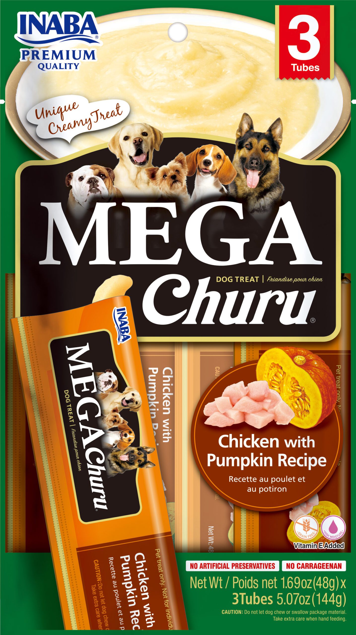 Los Mega Churu de Pollo y Calabaza son la versión más grande y espesa del Churu original que tu perro adorará. Con deliciosos sabor a pollo y calabaza. Sin granos, conservantes ni colorantes artificiales. Cada paquete incluye 8 paquetes individuales para mantener la máxima frescura. Cada delicioso Mega tubo contiene 91% de humedad y solo 20 calorías. Guárdelo en el congelador para realizar caminatas de verano, viajes al parque o caminatas y brinde a su cachorro un refrigerio saludable, frío e hidratante. Para perros de todos los tamaños y edades.