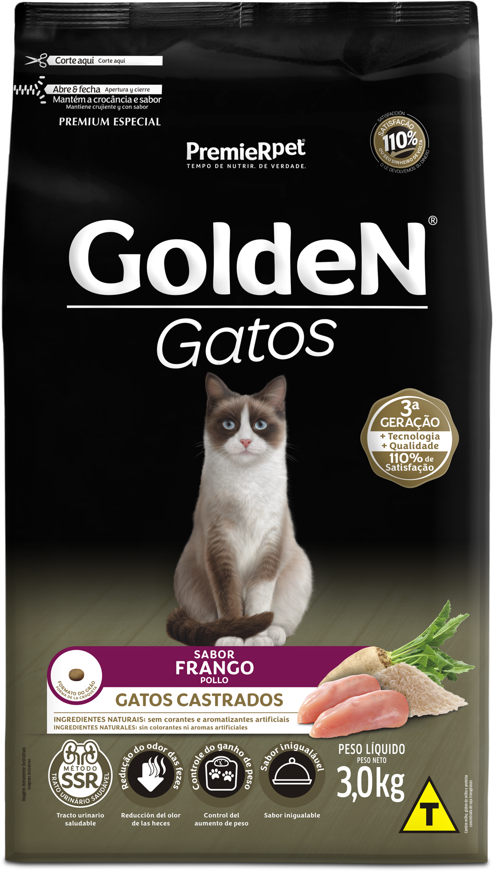 Especialmente formulada para atender las necesidades de los gatos castrados, GoldeN® Gatos Castrados Pollo actúa en la prevención de la obesidad y en el cuidado con el tracto urinario, garantizando una nutrición óptima y sana.
