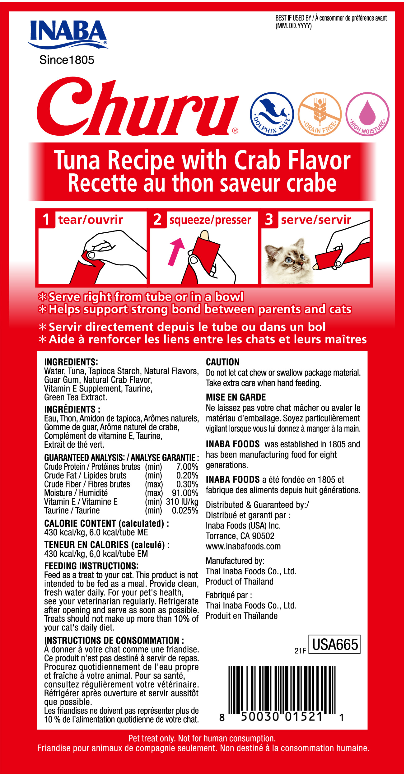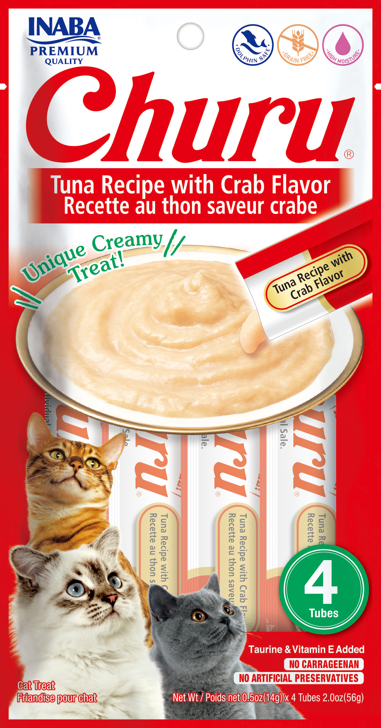 Ciao Churu™ Atún con Cangrejo es un novedoso y delicioso snack* para gatos de textura cremosa (puré) y alta palatabilidad. Tiene un alto contenido de humedad lo que encanta a los gatos y además contribuye a su hidratación. Con delicioso sabor de atún y cangrejo. Cada paquete contiene 4 tubitos de 14 gr c/u (Total 56 gr). Libre de granos, sin conservantes ni colorantes artificiales.