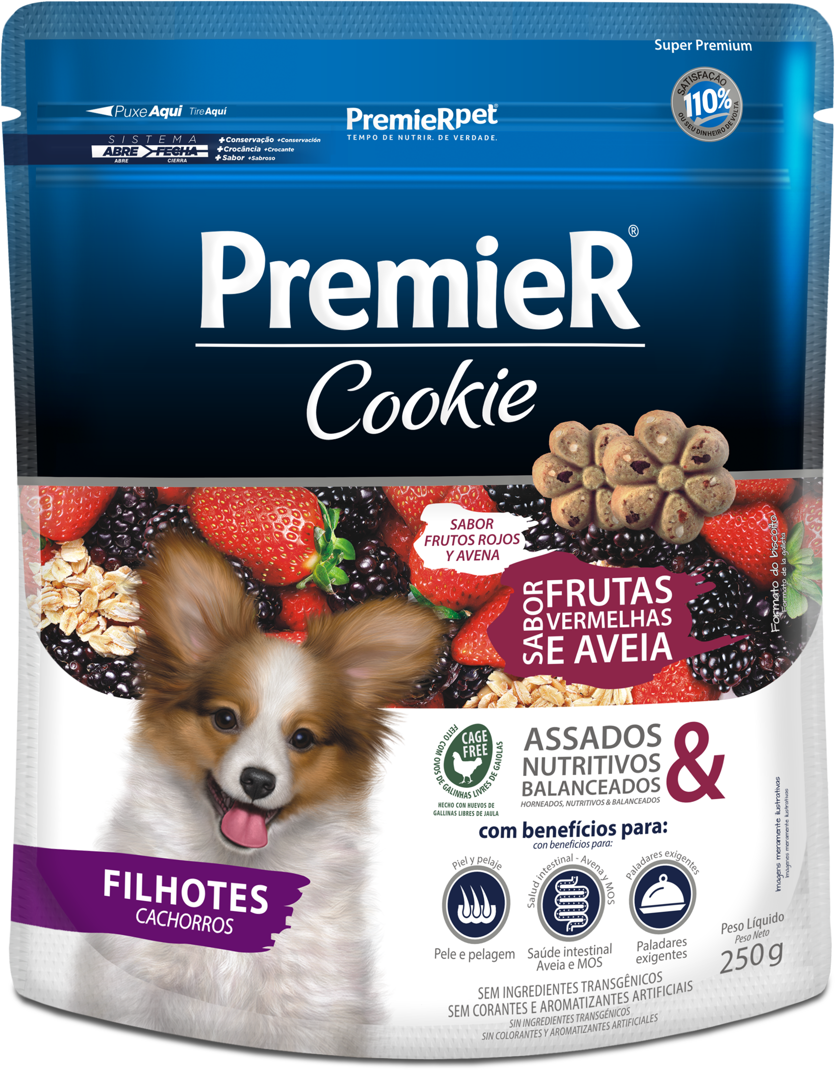 Para retribuir de forma divertida el amor incondicional y la amistad que los perros nos ofrecen, PremieRpet creó Premier Cookie, una galleta que reúne calidad, salud y sabor y es diferente de los productos actualmente disponibles en el mercado. Premier Cookie es horneado, saludable y nutritivo. Tiene ingredientes cuidadosamente seleccionados y satisfacción comprobada. PremieR Cookie Cachorros Frutos Rojos y Avena es indicado para cachorros, y tiene todos los beneficios de la línea PremieR Cookies sumados a la exclusiva combinación de frutilla, mora y avena — ingredientes saludables y que dan todavía más sabor a las galletas.