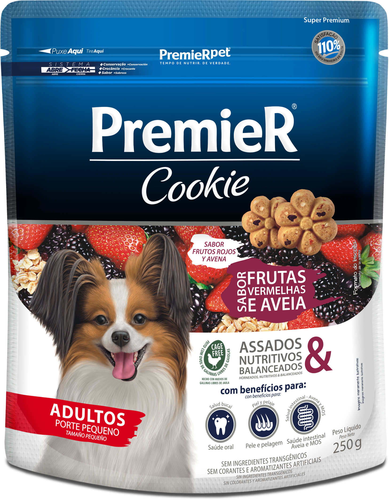 PremieR Cookie Perros Adultos Frutos Rojos y Avena es indicado para perros adultos de pequeño porte, y tiene todos los beneficios de la línea PremieR Cookies sumados a la exclusiva combinación de frutilla, mora y avena — ingredientes saludables y que dan todavía más sabor a las galletas.