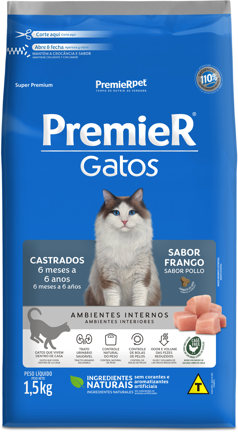 Premier Gatos Castrados desde los 6 meses hasta los 6 años Pollo es un alimento Super Premium que hace parte de la línea PremieR Gatos Castrados, una línea de alimentos especialmente desarrollada para garantizar lo máximo en salud y vitalidad a los gatos a través de cuidados nutricionales específicos tras la castración