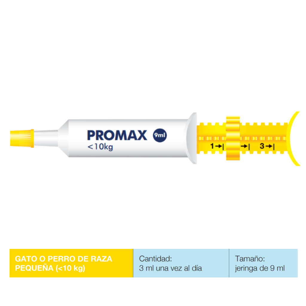 PROMAX® está disponible en forma de pasta palatable, en jeringas con dosis específicas según el tamaño de la raza, con cantidades diarias ya medidas. Solo necesitas administrarlo una vez al día, lo que lo hace lo más fácil posible para ayudar a tu mascota.