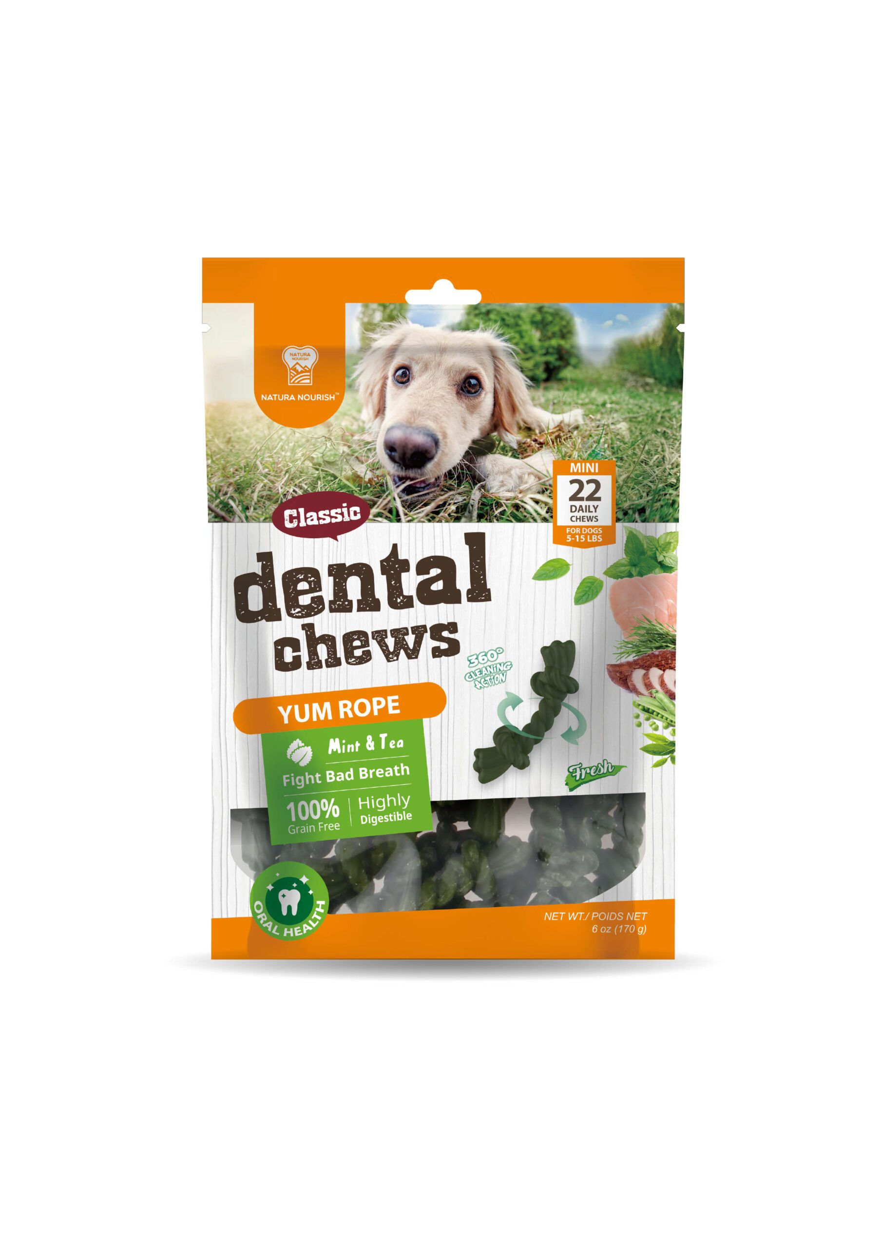 Natura Nourish Classic Dental Chews Yum Rope Sabor Menta son deliciosos snacks dentales para perros con forma divertida, 100% libre de granos, hecho a base de Menta y té. Ayuda a luchar contra el mal aliento y es fácil de digerir. Su forma de cuerda consigue una limpieza de 360° que ayuda a reducir la formación de sarro y placa. Los antioxidantes en el té inhiben el crecimiento de bacterias que pueden causar mal aliento y caries e incluso reducir el riesgo de cáncer oral. Neutraliza el mal aliento. Con clorofilina de cobre y sodio que ayuda a tratar las infecciones orales, la inflamación y el sangrado de las encías.